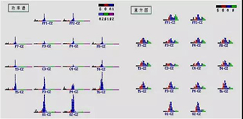 6.脑电地形图:以蓝绿黄红紫的顺序进行分级(分为0~16级颜色,分别表示从低到高的能量或功率级别),将计算出的参数值绘制在大脑模式图上,形成α、β、θ和δ以及慢波(θ+δ)脑电地形图,用以表示大脑各区域的等电位分布地形图和各部位波形的能量或功率级别。