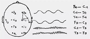 2.导联组合:在单极法常规描记采样的基础上,根据具体情况再行双极法和三角定位描记与采样。在常规单、双极描记中发现有局限性异常时,进行三角定位,δ波等慢波常发生相位倒置,而棘、尖波等发现波顶相对的针锋相对,两个位相倒置的导联的共同处即为病灶部位。