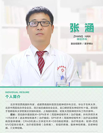 神经外科贾映海教授成功实施三叉神经痛、面肌痉挛、面瘫、颅内肿瘤等神经外科治疗上千例;北京常驻西南脑科张涵博士先后成功实施典型病灶切除手术150例、DBS治疗帕金森病数例,VNS迷走神经刺激术治疗难治性典型20多例、SPN手术周围神经缩窄术治疗偏瘫百余例,还治疗了神经疼痛多达一千多例。