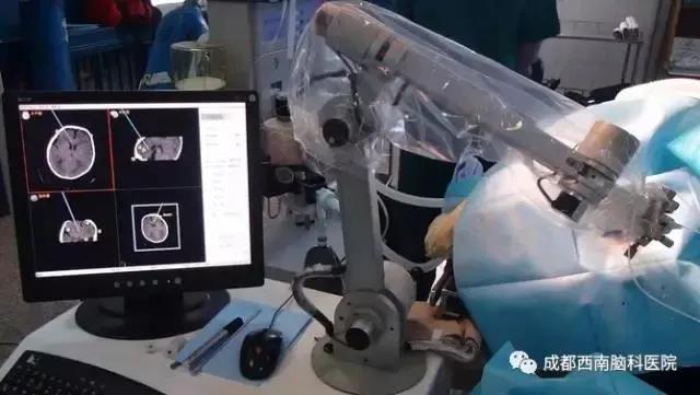 用影像学定位(CT、MRI或DSA)和立体定向仪引导来构建三维立体的脑部结构图,应用美国耶鲁大学的机器人动力机械臂,通过靶点定位后,动力机械臂能以0.1mm的重复精度保持稳定的轨迹,误差低于0.1毫米,确保手术准确无误。