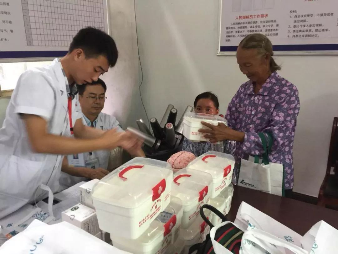 本次活动中,由脑科及大学生志愿者组成的5人服务团队,为44名残疾人和脑病患者发放了康复宣传手册、急救医药箱和常用药品,西南脑科医院杨君伟为他们进行了一对一的康复指导,详细了解患者的身体情况及治疗情况,并提出了具有针对性的康复建议,向患者普及健康和急救知识。